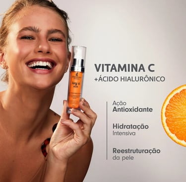 Ativos principais: Vitamina C nanoencapsulada, Ácido Hialurônico, Nanoesferas de Retinol, Extrato de Acerola e Lingonsten.