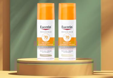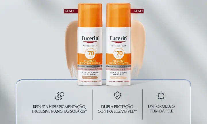 Conheça a linha Eucerin Sun Pigment Control Tinted FPS 70 nas cores Claro e Médio. Proteção solar + ação clareadora para manchas.