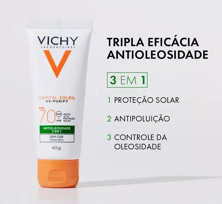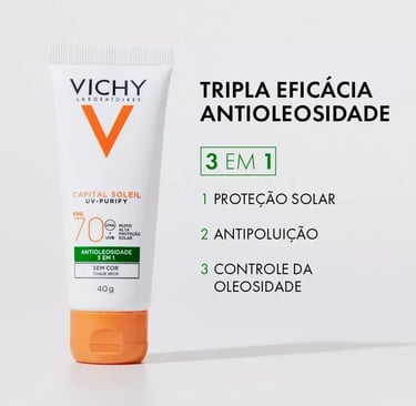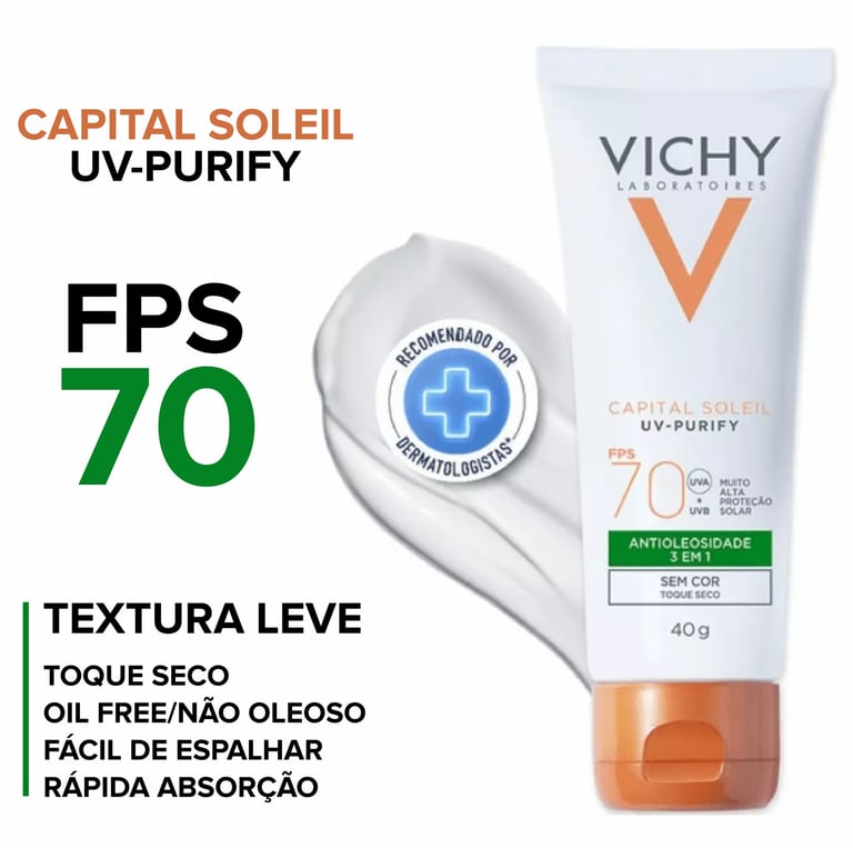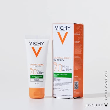 O Vichy Capital Soleil UV-Purify FPS 70 é um protetor solar facial de alta performance, desenvolvido para oferecer proteção avançada contra os raios UVA e UVB, enquanto controla a oleosidade e purifica a pele.